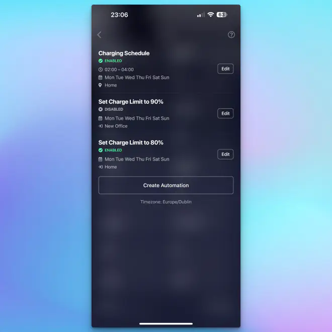 My favourite automation is being able to set a charging schedule, for anyone who has a time-of-use home electricity tariff it is fairly common to have a period of time which is cheaper than the rest of the day, for my provider I have a “boost” period between 2-4am when the electricity is cheaper.