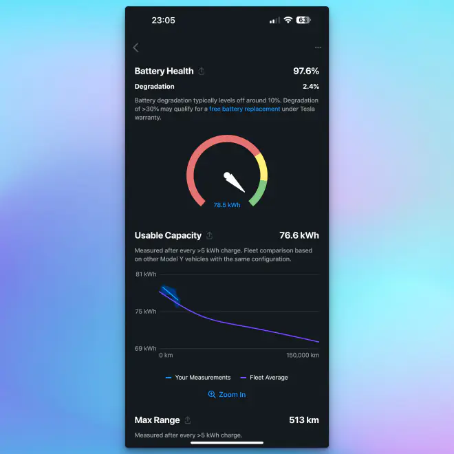 Using the information which the API is exposing and leveraging the data that Tessie has from other users means you can compare the current charge “health” of your battery.