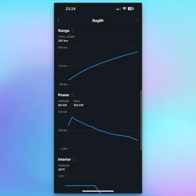 Another bonus is that it also charges information about your charge such as the energy and range added as well as the power of that charge which is nice to know as it clearly shows the charging curve of your cars battery.